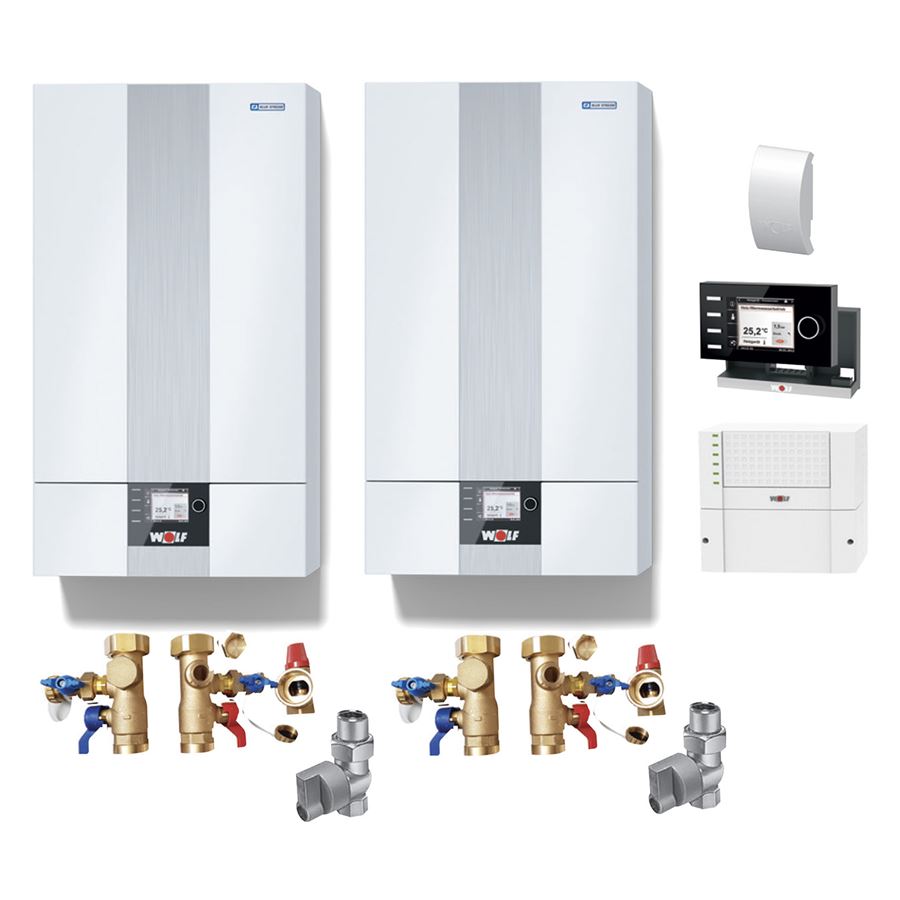 ZOSTAVA obsahuje: 2x kotol CGB-2-38, 2x zobrazovací modul AM do kotla a modul BM-2 vrátane nástenného držiaka a vonkajšieho snímača, kaskádový modul KM-2, 2x pripojovacia zostava nad omietku s odbočka...