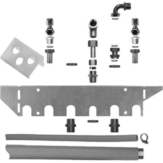 konzula na inštaláciu pod/nad omietkou, 2 vlnovcové rúrky dĺžky 800 mm, 2 vlnovcové rúrky dĺžky 1000 mm, 2 prípojky prívod/spiatočka, 2 spojky 3/4", 2 T-kusy s ozvzdušnením, dvojitá závitová spojka, 1 odvod kondenzátu, koleno 90° 1/2", prepojenie 90° 3/4"
