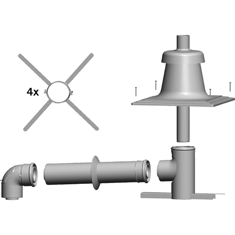obsahuje: revízne koleno 87° na pripojenie na kotol resp. T-kus 87°, rúru DN 80/125 dĺžky 500 mm, rozetu, koncentrické oporné koleno 87°, 4 dištančné držiaky, plastový kryt šachty s integrovaným vedením spalín a vzduchu, rúra vyústenia UV-stabilizovaná