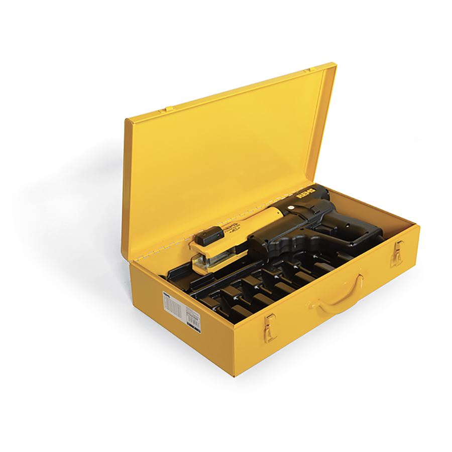 elektrohydraulický lis s núteným chodom a otáčavým uložením lisovacích klieští, 230 V, 50-60 Hz, 450 W v pevnom plechovom kufri žltej farby.
