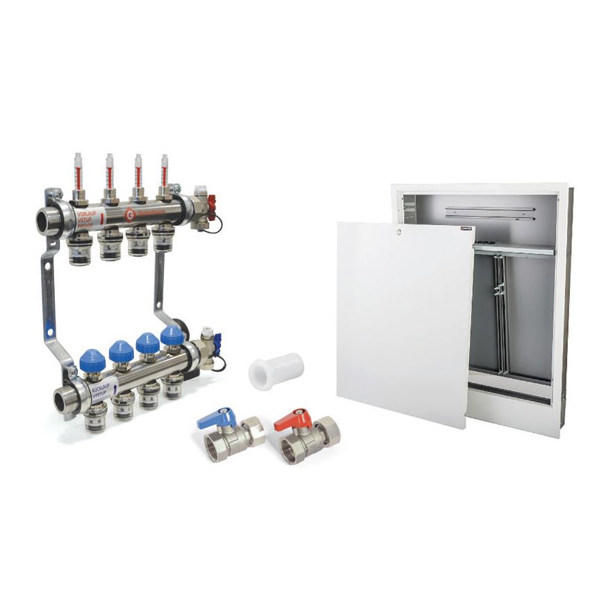 Zostava obsahuje: rozdeľovač VSS Push Fit, oporné puzdrá POM GT-SH 15, uzatváracie kohúty GT-AVR 1“, skrinku na montáž pod omietku PWS