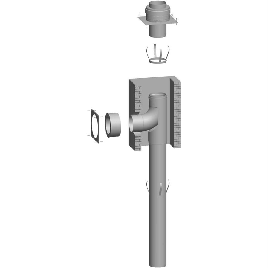 na pripojenie kotlov nezávislých od vzduchu v miestnosti, C33x, obsahuje:- kryt šachty DN 315 (ušľachtilá oceľ) s rúrou vyústenia (ušľachtilá oceľ)- dištančný držiak DN 315 (ušľachtilá oceľ)- oporné koleno 90° DN 250 (polypropylén) s podopretím a oporn