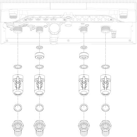obsahuje:- 4 x guľový kohút na pitnú vodu G 3/4" rohový 90°- 4 x ploché tesnenie G 3/4"- 4 x vlnitá antikorová rúrka DN 16, 500 mm (s plochýmitesneniami)- 4 x súprava na skrátenie vlnitej rúrky DN 16 (s plochýmitesneniami)- 2 x redukcia 3/4" x 1/2"