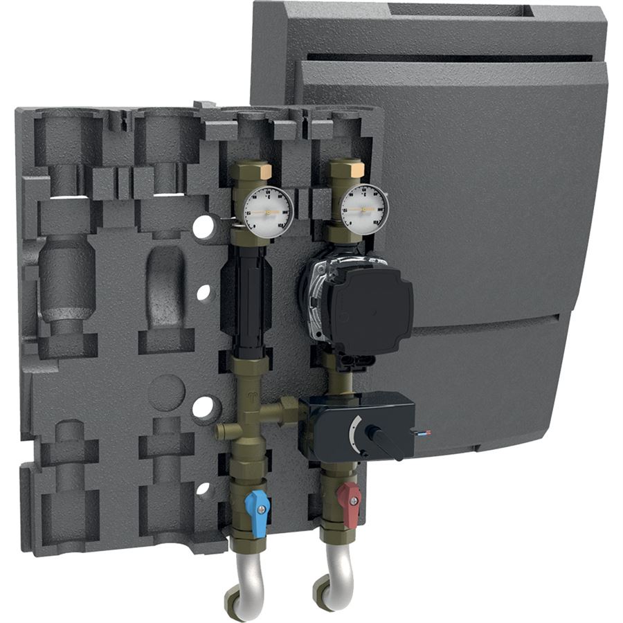pre nízkoteplotný a vysokoteplotný vykurovaní okruh, obsahuje: obehové čerpadlo DN 15-50 trojstupňové alebo modulované triedy A, 3-cestný zmiešavač DN 20, kvs=4,0 so servopohonmi (230 V/210 s), po 2 guľové kohúty v prívode a spiatočke na servis bez vypúšťania
