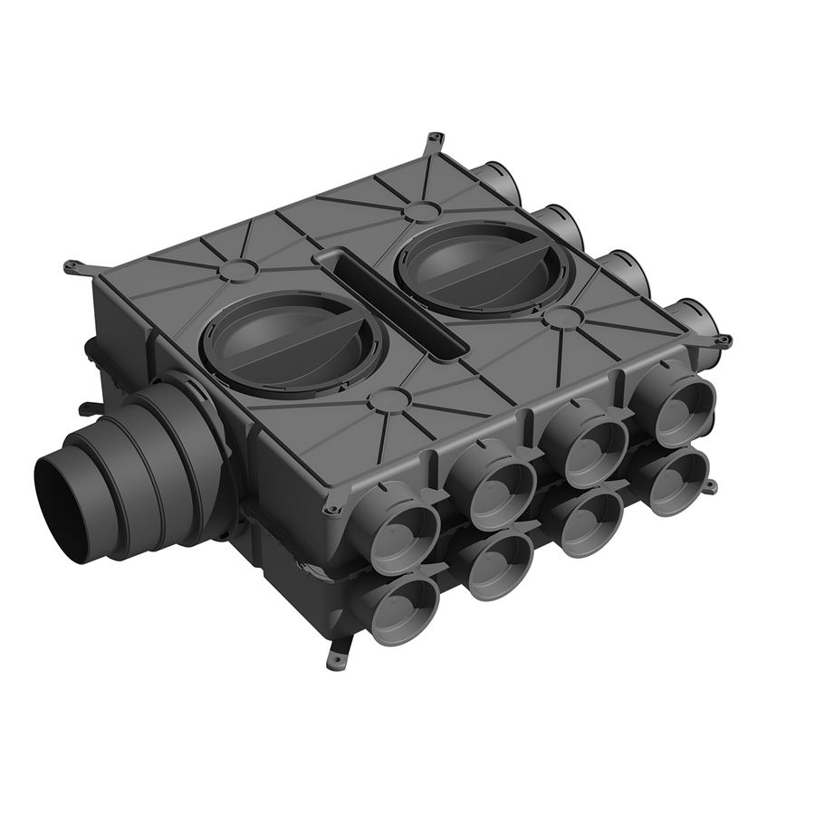 na prívod alebo odvod vzduchu, 16 hrdiel DN 75 so 8 viečkami, pre prípojky s kruhovým/plochým prierezom DN63, 500x100 a 50x140 je na pripojenie potrebný adaptér. Pre rozmer 50x140 je možné max. 6 pripojení. Použiť max. 12 pripojení.
