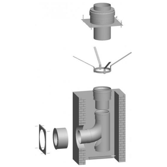 na pripojenie kotla nezávislého od vzduchu v miestnosti, C33x, obsahuje:- kryt šachty DN 200 (ušľachtilá oceľ) s rúrou vyústenia (ušľachtilá oceľ)- dištančný držiak DN 200 (ušľachtilá oceľ)- rozšírenie DN 160 na hrdlo DN 200 (polypropylén)- oporné kol